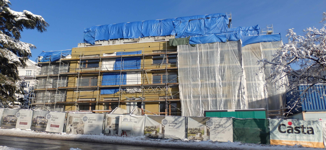 Výstavba energeticky pasivního projektu Rezidence Červený dvůr, jehož kolaudace by měla proběhnout na konci letošního léta, pokračuje podle plánovaného harmonogramu. Aktuálně dokončujeme vnitřní omítky a provádíme hrubé podlahy. Již za pár týdnů se navíc chystáme zahájit finální terénní úpravy předzahrádek. V rozestavěném projektu můžete stále vybírat ze tří volných bytů.